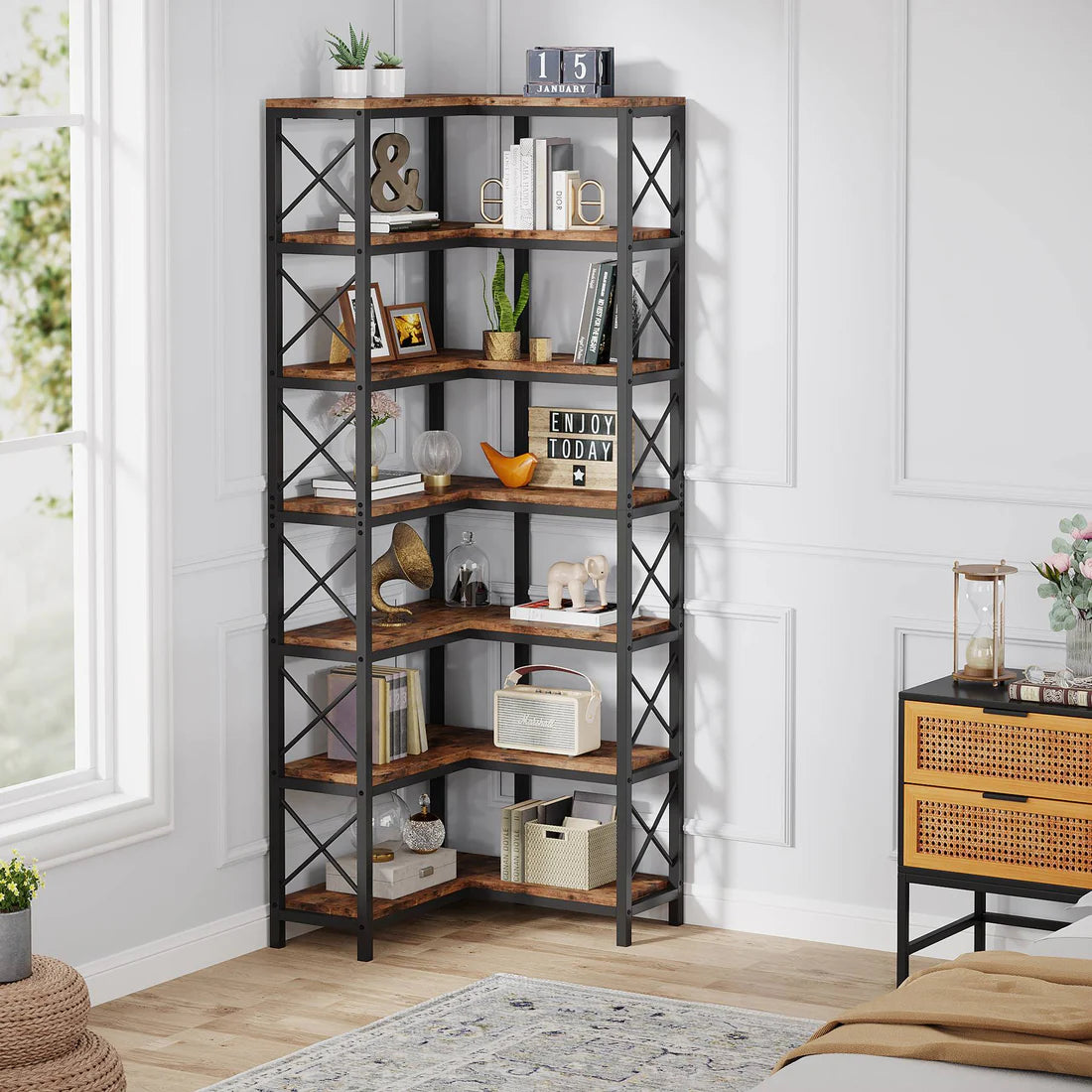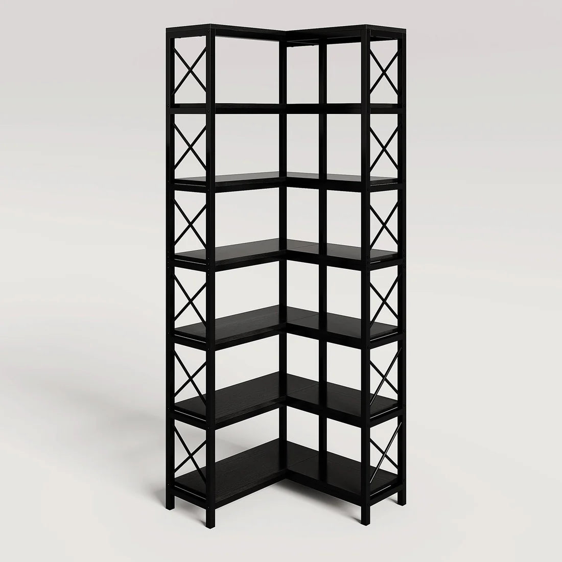 Elevate your interior with this 7-tier corner bookshelf, a perfect blend of industrial charm and practical functionality. Featuring a rustic wood finish, black metal frame, and distinctive X-bar supports, this tall bookcase adds visual appeal while maximizing your storage potential. Ideal for living rooms, home offices, bedrooms, or studios.