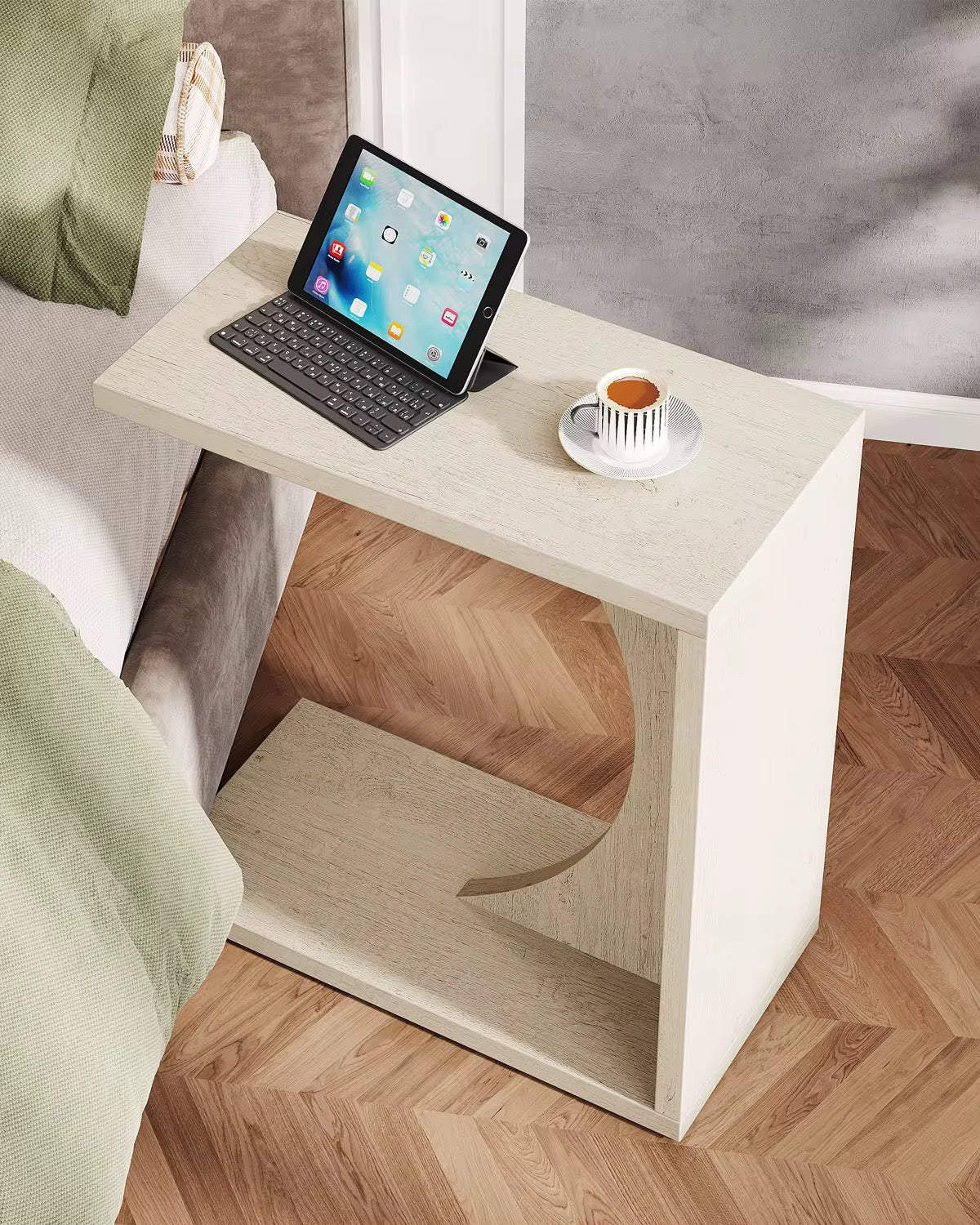 Introducing the C-Shaped End Table for Sofa & Bedroom – Compact Side Table for Living Room. This sleek and highly functional piece features a space-saving cantilevered design that slides seamlessly under your sofa or beside your bed, offering a convenient surface for work, snacks, or decor.
